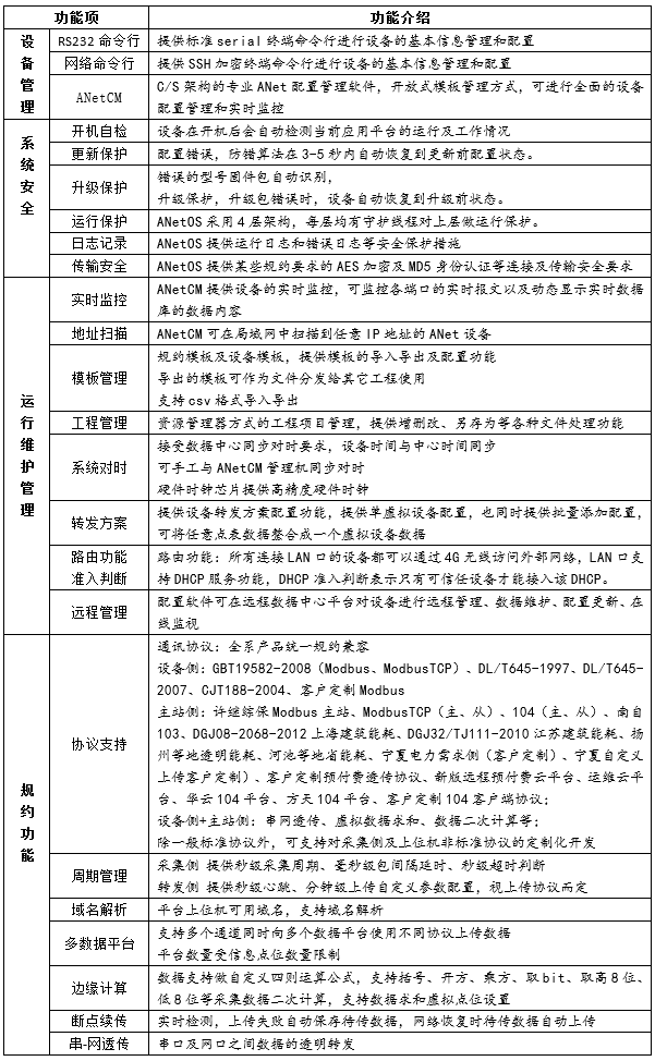 ANet智能通信管理機作為自動化系統(tǒng)網(wǎng)絡與監(jiān)測設備之間的通信接口設備,提供規(guī)約轉換、透明轉發(fā)、數(shù)據(jù)加密壓縮、數(shù)據(jù)轉換、邊緣計算等多項功能。