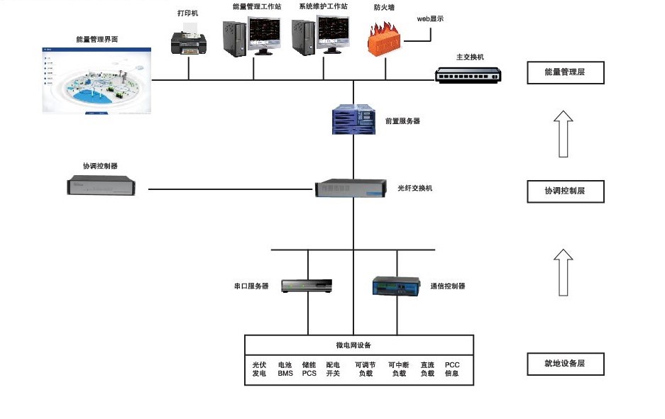 微電網(wǎng)能量管理控制系統(tǒng)軟件體系結構由操作系統(tǒng)、支撐平臺、應用功能共三個層次組成,應用功能又分為基本應用功能和高級管理功能兩個部分,如下圖所示。操作系統(tǒng)支持跨平臺,支撐平臺包含數(shù)據(jù)采集管理、數(shù)據(jù)庫管理、網(wǎng)絡通信管理、圖形管理、報表管理、權限管理、報警管理、計算統(tǒng)計等模塊?;緫霉δ馨⊿CADA處理、監(jiān)控功能、統(tǒng)計分析功能、安全WEB數(shù)據(jù)發(fā)布等。高級管理功能包括全局能量管理目標制定等。