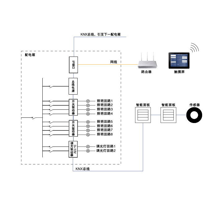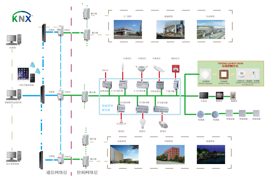 系統(tǒng)通過標準的2*2*0.8EIB BUS總線(即KNX總線)將所有的智能照明控制模塊連接到一起,并組成一套完整的控制系統(tǒng)。該系統(tǒng)理論最大連接控制模塊數(shù)量達58000多個,在實際項目應(yīng)用中,系統(tǒng)即可實現(xiàn)照明燈具的遠程集中控制,又可實現(xiàn)就近控制功能。其靈活多樣的智能化控制及龐大的設(shè)備容量,特別適用于醫(yī)院、學(xué)校、酒店及各類體育場所、機場、隧道等大型公建項目照明系統(tǒng)的智能化控制。