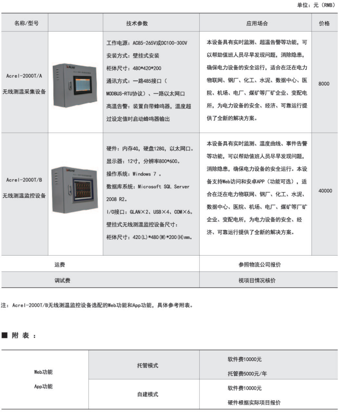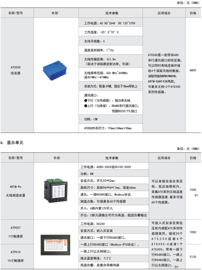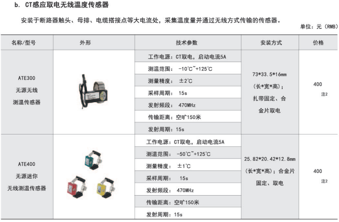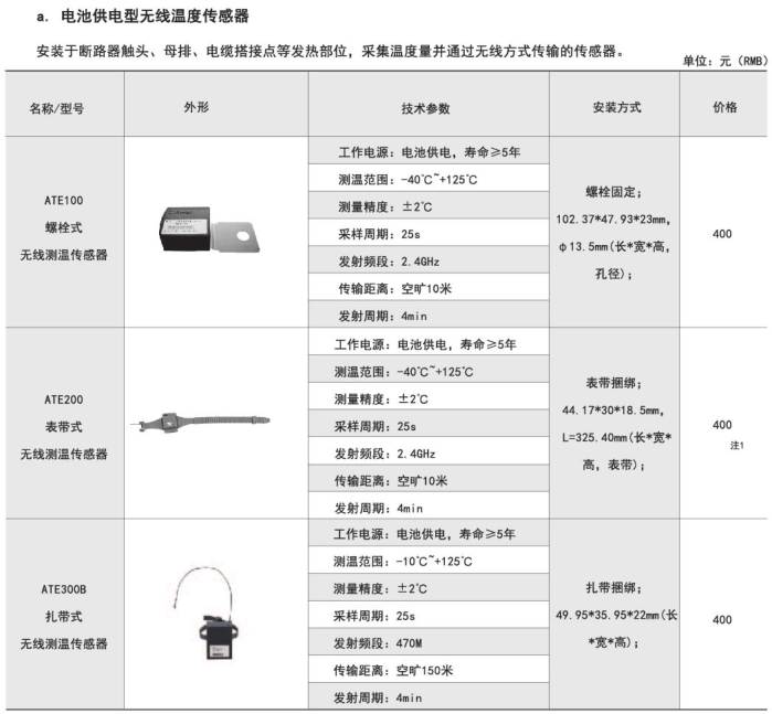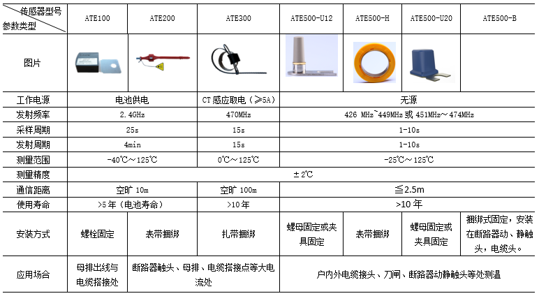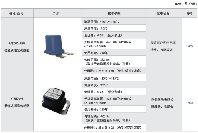 適用于高低壓開關(guān)柜內(nèi)電纜接頭、斷路器觸頭、刀閘開關(guān)、高壓電纜中間頭、干式變壓器、低壓大電流等設(shè)備的溫度監(jiān)測(cè)。訂貨范例: