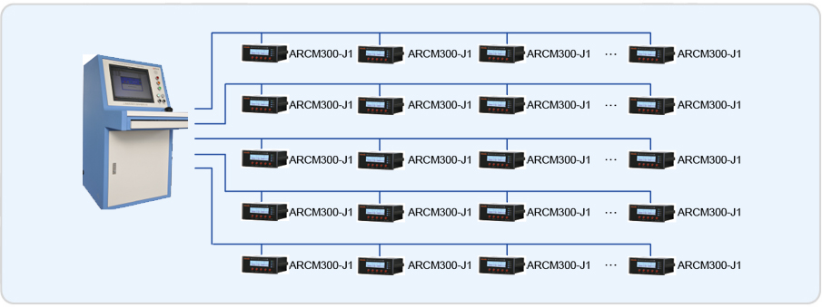 松江華亭小學現(xiàn)場共有ARCM300-J1剩余電流式儀表147只,分別分布于2幢教學樓/、1個圖書館、1幢綜合樓、1個食堂。現(xiàn)場儀表采用總線方式接至位于圖書館的Acrel-6000琴臺式電氣火災監(jiān)控系統(tǒng)。
