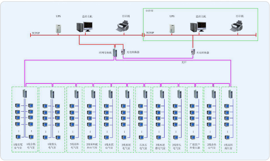 中材萍鄉(xiāng)水泥有限公司廠區(qū)重點用電回路分別分布于1線原料高壓室、1線窯尾電氣室、1線窯頭電器室、2線原料電器室、2線原料配料電氣室、1線水泥電氣室、2線窯尾電氣室、石灰石電氣室、2線水泥磨電氣室、2線窯頭電氣室、廠前區(qū)戶外變壓器、1線余熱電氣室以及2線余熱電氣室等共計13個電器室內(nèi)。