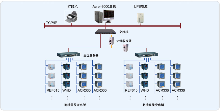 該系統(tǒng)總計有352只儀表(其中包括330只ACR網絡多功能電力儀表,12只ABB綜合保護裝置,10只變壓器溫控儀),分20條總線,其中北樓泉屋變電所8條總線,南樓美羅變電所12條總線,兩變電所之間距離較遠,采用光纖組網連接,再通過網線拉至南樓美羅變電所值班室連接到監(jiān)控主機實現總線上儀表與監(jiān)控主機的數據連通。