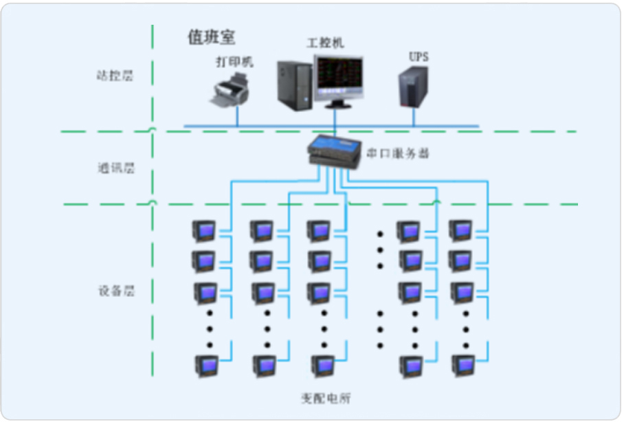 本項(xiàng)目設(shè)計(jì)為變配電所部分電力監(jiān)控系統(tǒng),變配電所位于地下一層,其中有兩路高壓進(jìn)線,配有綜合保護(hù)裝置,低壓部分,進(jìn)線柜、饋線柜配有儀表,本電力監(jiān)控系統(tǒng)監(jiān)控范圍為低壓部分裝置。通過(guò)組建系統(tǒng)網(wǎng)絡(luò),電力儀表通過(guò)現(xiàn)場(chǎng)總線直接接入變電所內(nèi)采集設(shè)備,并將數(shù)據(jù)上傳至Acrel-2000電力監(jiān)控系統(tǒng),實(shí)時(shí)監(jiān)測(cè)變電所內(nèi)各個(gè)回路的電流、電壓、功率、開關(guān)狀態(tài)等電參量,由此達(dá)到變電所少人值守或無(wú)人值守的智能化管理。