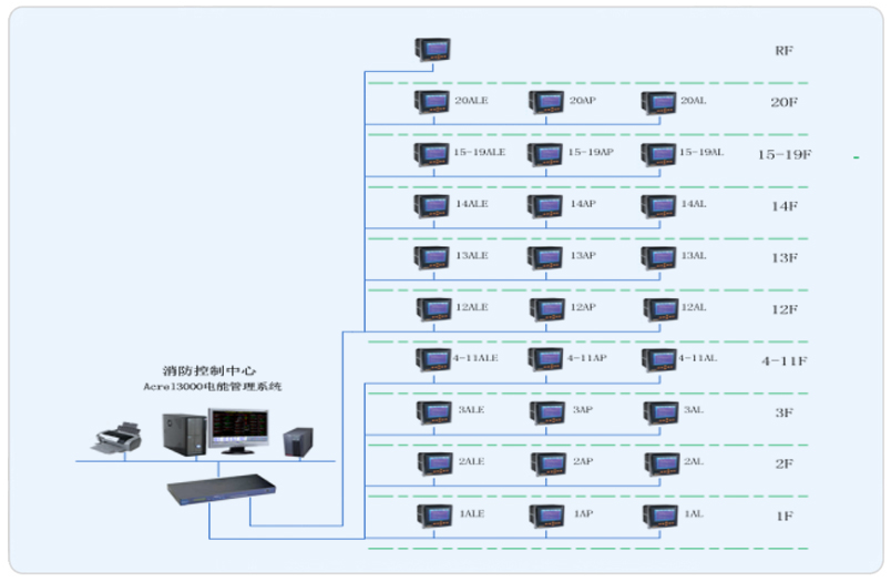 我司本項目承接其樓層部分電能管理系統(tǒng)搭建,完成對配電回路用電的實時監(jiān)控和管理。該項目進出線回路均采用ACR多功能液晶顯示儀表,其是針對電力系統(tǒng)、公共設(shè)施、智能大廈的電力監(jiān)控需求而設(shè)計的網(wǎng)絡(luò)電力儀表,它能測量所有常規(guī)電力參數(shù),如:三相電壓、電流、有功功率、無功功率、功率因數(shù)、頻率、有功電度、無功電度?,F(xiàn)場儀表以手拉手方式通過屏蔽雙絞線(RVVSP2*1.0)進行通訊連接,每根總線連接智能儀表數(shù)量在20只左右,不同種類的智能裝置連接在不同的總線上,然后將數(shù)據(jù)上傳至數(shù)據(jù)采集器,進而將數(shù)據(jù)上傳至當?shù)乇O(jiān)控終端。