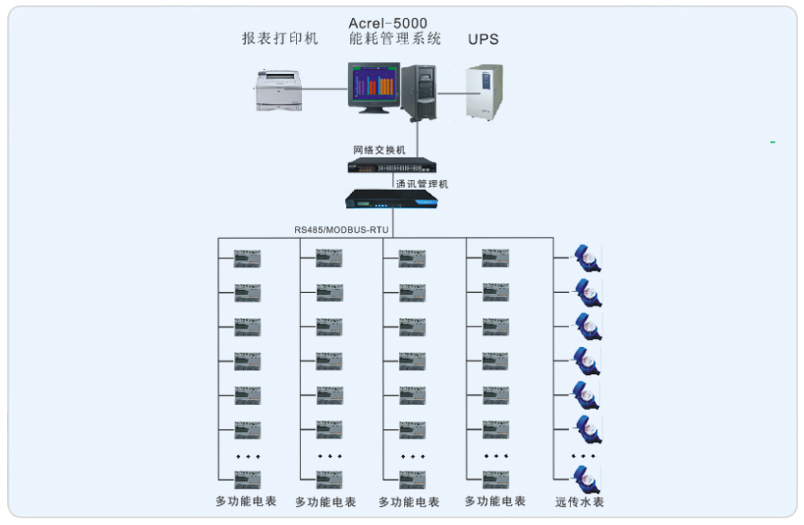 系統(tǒng)采用Acrel-5000型能耗檢測系統(tǒng),整個系統(tǒng)采用網(wǎng)絡(luò)分布式結(jié)構(gòu),監(jiān)控主機位于旋極科技大廈一樓機房內(nèi),現(xiàn)場電表在每個樓層的南北區(qū)內(nèi)。水表分布在每層的男女廁所的豎井里。所有配電回路均配備安科瑞電力儀表DTSY系列及積成光電直讀系列水表。該項目實現(xiàn)了旋極科技大廈主辦公樓的能耗檢測。所有監(jiān)控設(shè)備均通過屏蔽雙絞線至一樓的通訊管理機再通過網(wǎng)線連接到主機從而實現(xiàn)遠程監(jiān)控。