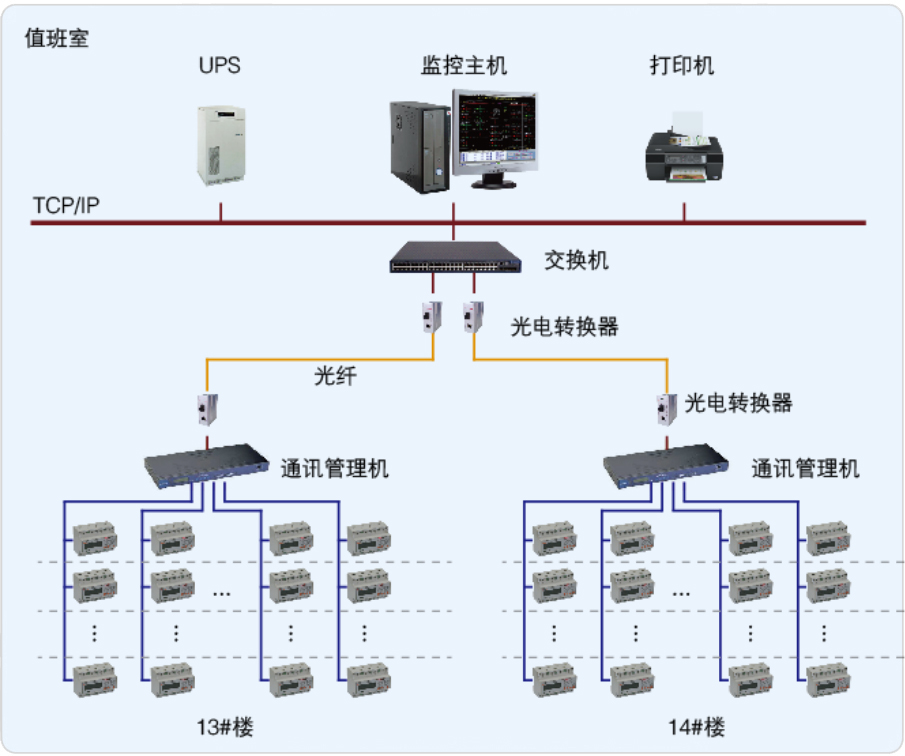 該項(xiàng)目有兩棟樓,均為六層,一共有532個(gè)房間,其中13#棟彝學(xué)院289個(gè)房間,14#棟藏學(xué)院243個(gè)房間,采用我司ADF100單相多用戶電能表195個(gè),分為24條RS485總線接至通訊管理機(jī),通訊管理機(jī)通過光纖拉至值班室連接到Acrel-3000預(yù)付費(fèi)電能管理系統(tǒng)后臺,實(shí)現(xiàn)總線上儀表與監(jiān)控主機(jī)的數(shù)據(jù)連通。該系統(tǒng)為學(xué)校宿舍項(xiàng)目解決用電問題提供了真實(shí)可靠的依據(jù),取得了較好的管理水平。