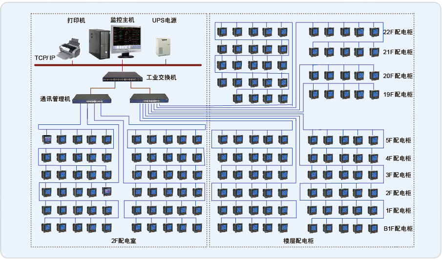 上海百樂(lè)門(mén)大酒店電力監(jiān)控系統(tǒng)監(jiān)控范圍為百樂(lè)門(mén)大酒店的22個(gè)樓層的PZ系列電力儀表和配電室的PZ、ACR系列電力儀表進(jìn)行遠(yuǎn)程監(jiān)測(cè)?,F(xiàn)場(chǎng)設(shè)備全集中在同一個(gè)配電室中,業(yè)主的電氣值班室就近安排在配電室旁,本系統(tǒng)監(jiān)控中心也安置在該值班室中。系統(tǒng)組網(wǎng)采用常見(jiàn)的3層結(jié)構(gòu),站控管理層、通訊管理層和現(xiàn)場(chǎng)設(shè)備層。