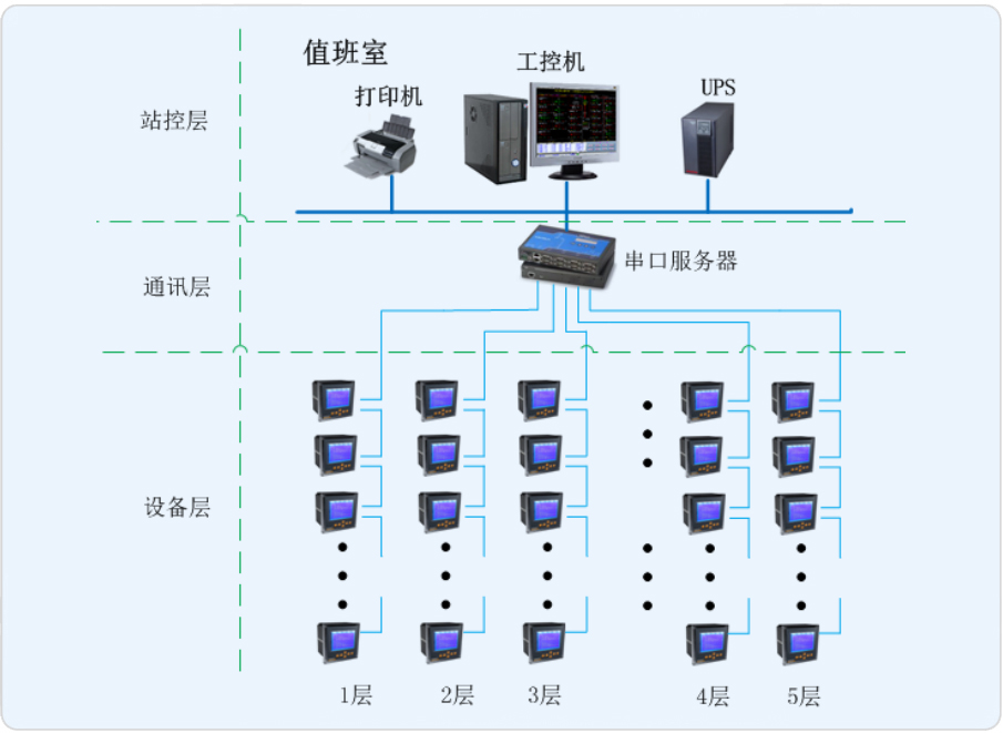 本項目是為羅店鎮(zhèn)市民服務中心樓層配電部分設計的電能管理系統(tǒng),監(jiān)控范圍為8層樓內(nèi)的多功能儀表?,F(xiàn)場多功能儀表通過總線接入值班室采集器,再將通過采集器連接到監(jiān)控主機,從而在監(jiān)控主機上實現(xiàn)總線上儀表與監(jiān)控主機的數(shù)據(jù)連通。通過Acrel-3000電能管理系統(tǒng)對樓層用電環(huán)節(jié)進行記錄與統(tǒng)計,借助計算機輔助手段進行集抄,節(jié)省人工成本。