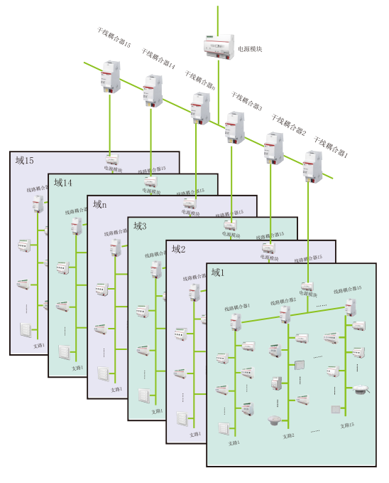 系統(tǒng)一般采用分層結(jié)構(gòu),搭建項(xiàng)目時(shí),劃分成域和支線這種分布式總線結(jié)構(gòu),一方面其布局清晰,布線簡(jiǎn)單,容量大,對(duì)各種類型的項(xiàng)目尤其是大型公建項(xiàng)目特別適用。另一方面有效提高了系統(tǒng)的可靠性。由于每個(gè)域和每條支路分別分配了KNX電源,這種電氣的隔離使得系統(tǒng)的某個(gè)部分出現(xiàn)故障時(shí),其他部分仍能繼續(xù)工作。一條線路或一個(gè)域內(nèi)的數(shù)據(jù)通信不會(huì)影響到其它范圍的數(shù)據(jù)通信。