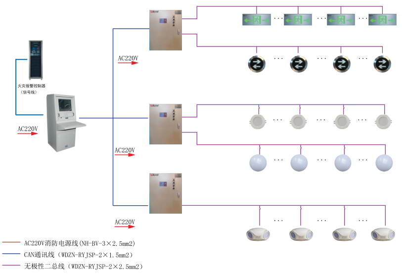 集中電源集中控制型消防應(yīng)急照明和疏散指示系統(tǒng)采用應(yīng)急照明控制器(主機(jī))+集中電源+燈具三層結(jié)構(gòu)組網(wǎng)模式,適用范圍廣,滿足各種環(huán)境的現(xiàn)場,便于區(qū)域化管理,燈具與分配電裝置之間采用二總線通訊,監(jiān)控器與集中電源之間采用CAN總線通訊,滿足了通訊實(shí)時性高的要求。