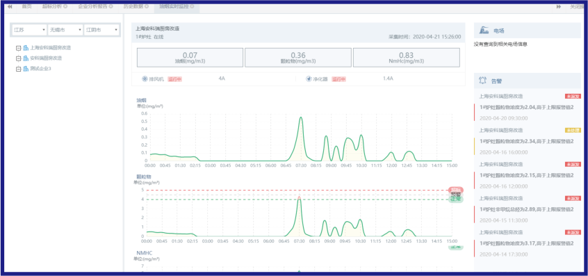 現(xiàn)場安裝監(jiān)測終端,持續(xù)監(jiān)測油煙凈化器的工作狀態(tài),包括設(shè)備運(yùn)行的電流,同時(shí)結(jié)合排煙口的揮發(fā)性物質(zhì)、顆粒物濃度等 進(jìn)行對比分析,一旦排放超標(biāo),系統(tǒng)會發(fā)出異常信號。