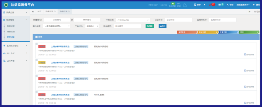 系統(tǒng)對采集的告警數(shù)據(jù)分析,產(chǎn)生對應(yīng)的隱患記錄,派發(fā)、處理隱患,及時(shí)處理告警,形成閉環(huán)。