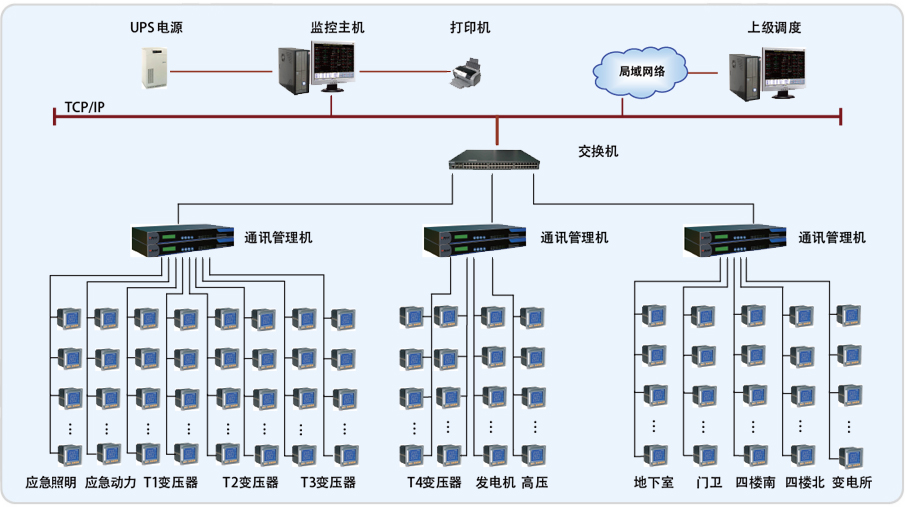 本監(jiān)控系統(tǒng)主要實現(xiàn)對月亮灣集中供冷中心的20/0.4kV配電系統(tǒng)進行監(jiān) 控;監(jiān)控范圍為變電所的T1、T2、T3、T4變壓器進線柜、聯(lián)絡(luò)柜、應(yīng)急照明配電屏1/2、應(yīng)急動力配電屏1/2、高壓柜、變電所的1/2#柴油發(fā)電機配電屏和各樓層所有動力柜。總共300個回路。