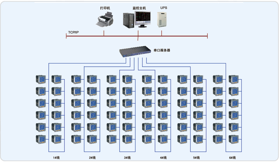 博歐木特種紙業(yè)有限公司三期電力監(jiān)控系統(tǒng)針對淄博歐木特種紙業(yè)有限公司內(nèi)三期低壓配電室開關(guān)柜內(nèi)安裝的安科瑞智能電力儀表,現(xiàn)場約120只儀表,監(jiān)控室位于配電室內(nèi)。為滿足配電室統(tǒng)一監(jiān)控的要求,配電室現(xiàn)場安裝安科瑞公司網(wǎng)絡(luò)電力儀表通過屏蔽雙絞線手拉手相連至串口服務(wù)器,串口服務(wù)器通過五類線接入后臺主機(jī),進(jìn)行數(shù)據(jù)傳輸。