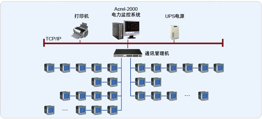 采用Acrel-3000電能管理系統(tǒng)實現(xiàn)遠程電參量(電流,電壓,功率,功率因素等)實時監(jiān)測與分類電能計量。以現(xiàn)場測得的最大需量(MD)與系統(tǒng)預先設定的需量限定值進行比較,在超量時報警。監(jiān)控系統(tǒng)主要分為3層:站控管理層(工控機、打印機、UPS電源)、通訊管理層(4口通訊管理機)、現(xiàn)場設備層(現(xiàn)場智能裝置)?,F(xiàn)場中的IO設備的通訊線纜采用RVSP 2*1.5屏蔽雙絞線,連接至4口通訊管理機。選配ACR220EL/K的多功能儀表,具有 LCD液晶屏顯示,可監(jiān)測三相電流、三相電壓、電網(wǎng)頻率、三相(有功功 率、無功功率、功率因數(shù))、三相有功電能、三相無功電能6項測量參數(shù)。